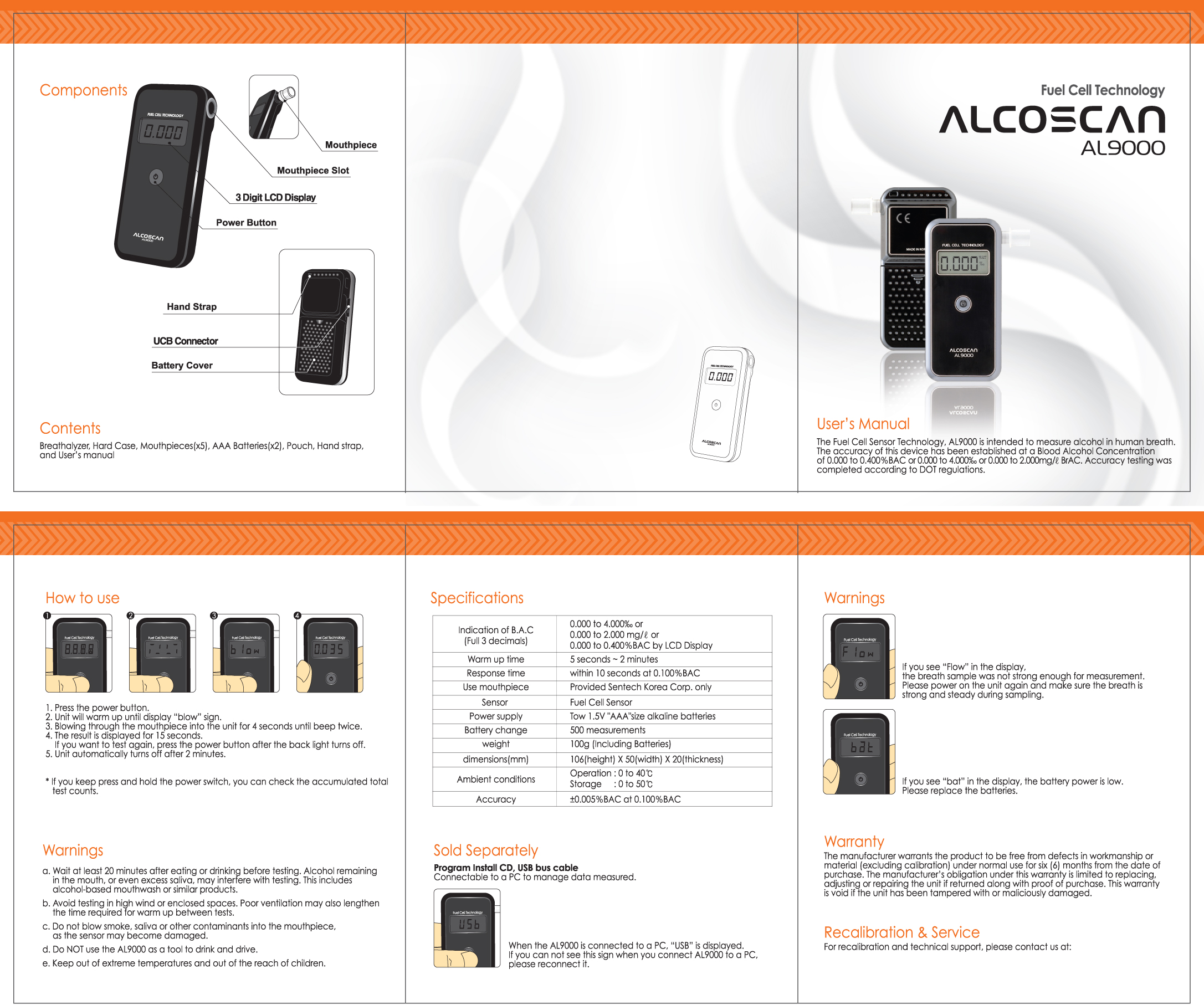 • Kilégzett alkoholtartalom kijelzés: 0.000 ~ 5.000 ‰ | 0.000 ~ 0.500 %BAC | 0.000 ~ 2.500 mg/l BrAC | 0.000 ~ 5.000 g/l | 0 ~ 250 µg/100mL | 0 ~ 2500 µg/L